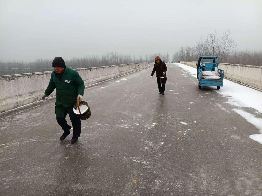 鲇魚須鎮(zhèn)組織人員對(duì)鲇魚須大橋開展撒鹽除冰工作