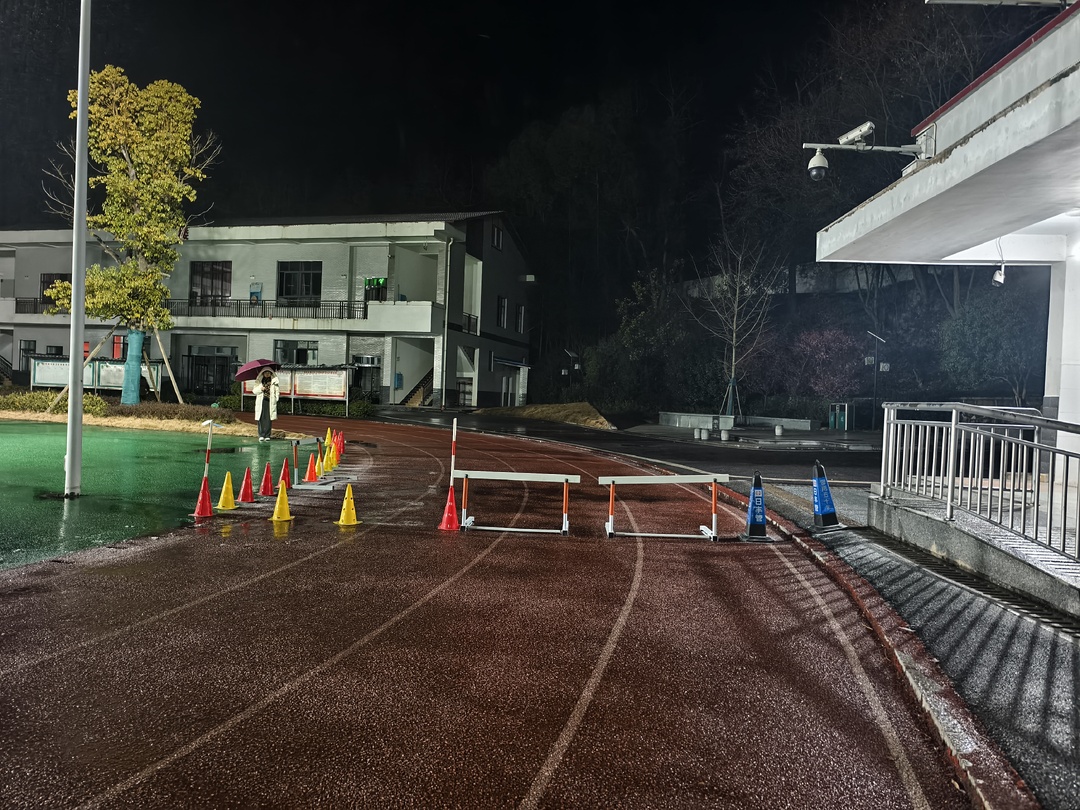 部署迅速轉(zhuǎn)化為行動(dòng)。1月19日晚上,學(xué)校政教處和后勤部門在學(xué)生宿舍樓梯、走廊與室外跑道連接處等易滑重點(diǎn)區(qū)域,架設(shè)起紅白相間的警示防護(hù)欄,筑起堅(jiān)固安全屏障,清晰引導(dǎo)學(xué)生行走在干燥、安全的中間通道。從早上六點(diǎn)多開始,工作人員便值守在宿舍樓前、教學(xué)樓口、食堂門口以及濕滑連廊附近,不斷提醒學(xué)生“慢行、看路”。校園內(nèi),關(guān)鍵通道上擺放著一排排醒目的紅黃警示錐,構(gòu)建起臨時(shí)“安全走廊”。