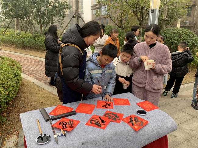 活動(dòng)現(xiàn)場(chǎng)還設(shè)置了親子寫福字對(duì)聯(lián)板塊,吸引了不少小業(yè)主們參加。孩子們?cè)诩议L和物業(yè)工作人員的陪伴下,揮毫潑墨,書寫出一幅幅充滿童趣與祝福的福字,為冬日的社區(qū)增添了一抹溫馨的色彩,讓這份冬日的溫暖更加實(shí)實(shí)在在,深入人心。